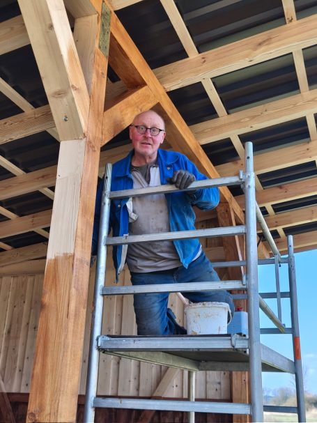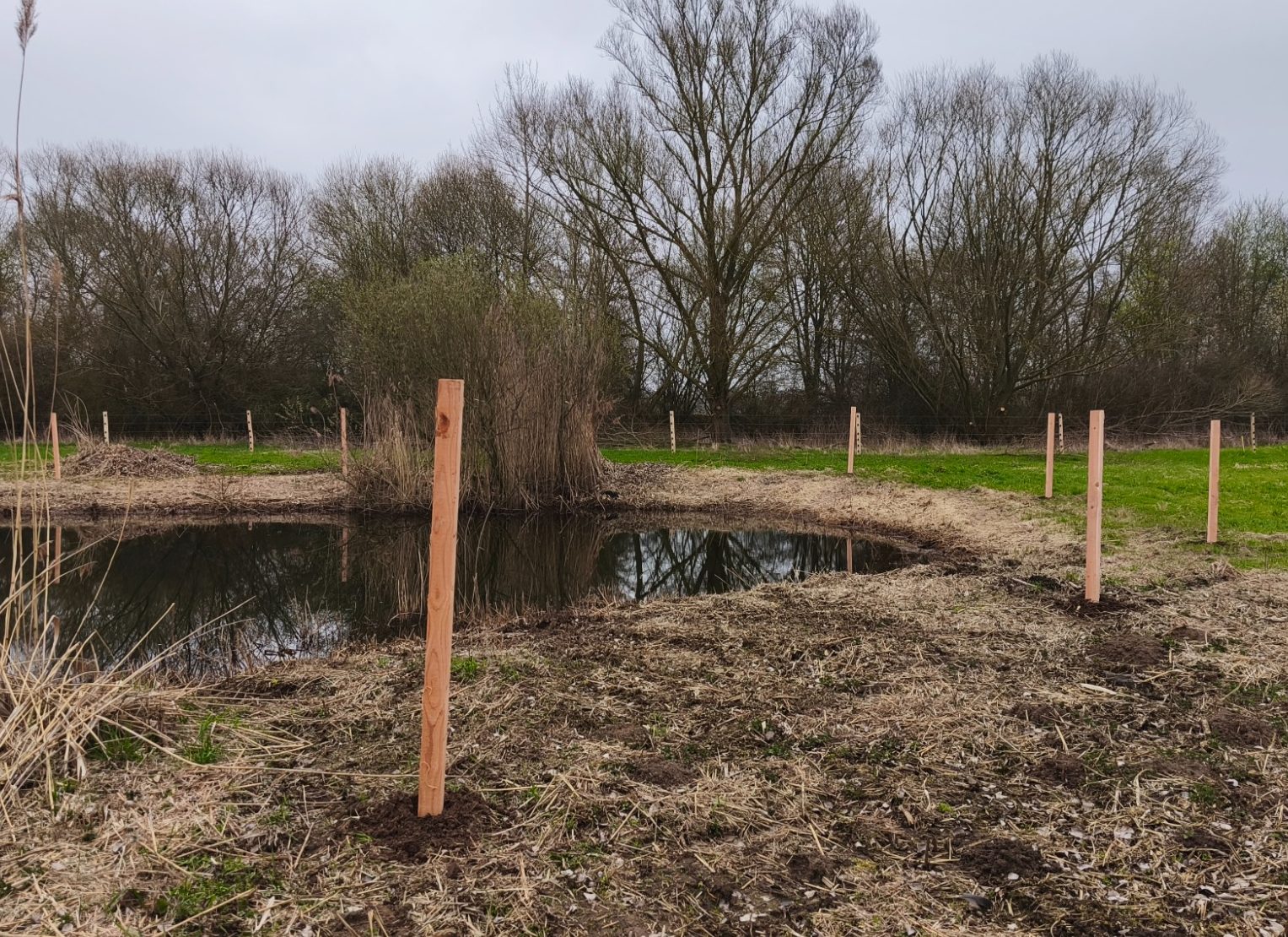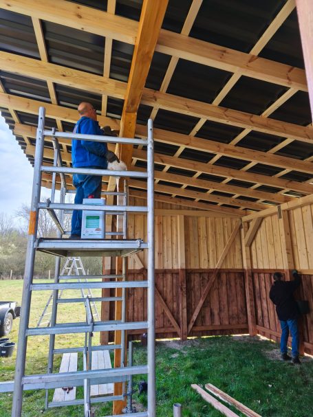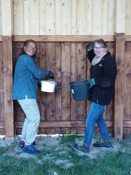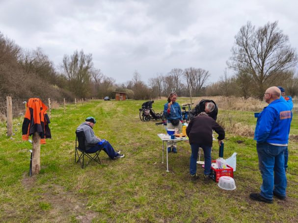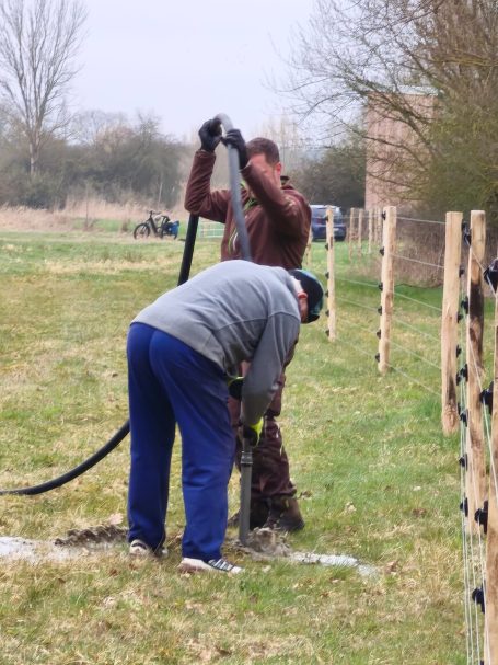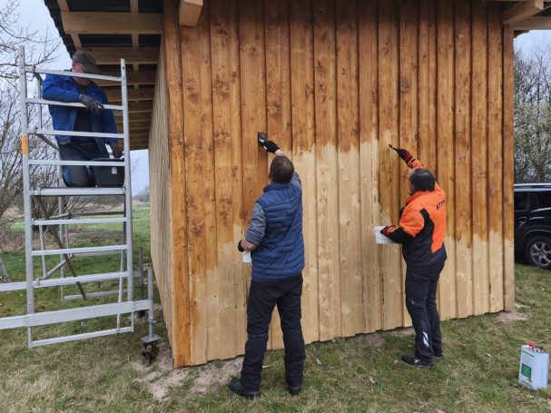 Fotonachlese: Gemeinsam für die Artenschutz-Beweidung u.a. Schutzanstrich Büffel-Unterstand, Kontrollgang Freihalten des Weidezaunes, bohren des Brunnens, Aufstellen des Schutzzaunes für die Krebsschere und anschließendes Picknick